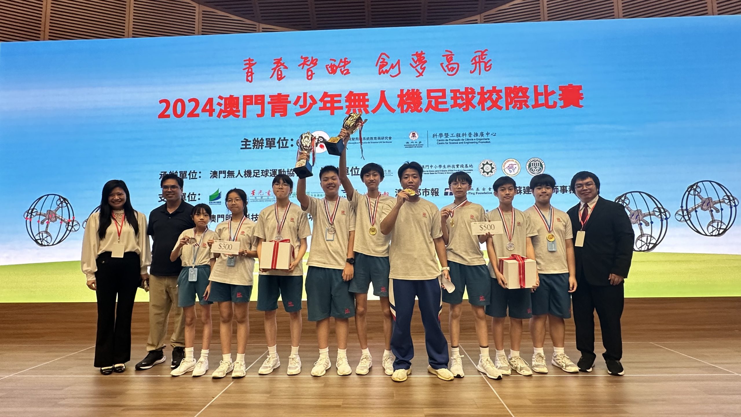 4月27日, 由澳門無人機駕駛飛機系統教育與研究會、澳門大學科學暨工程科普推廣中心主辦的“青春智酷 · 創夢高飛——二○二四澳門青少年無人機足球校際比賽”於澳門科學館舉行。
