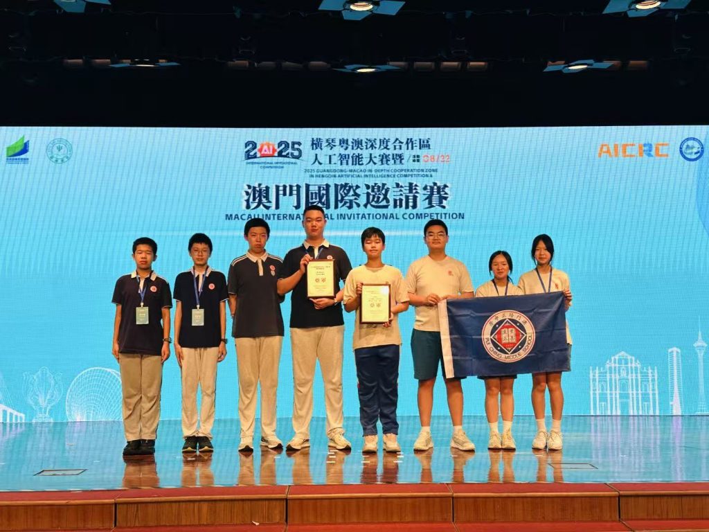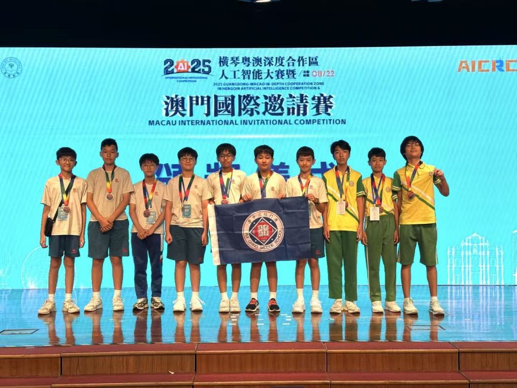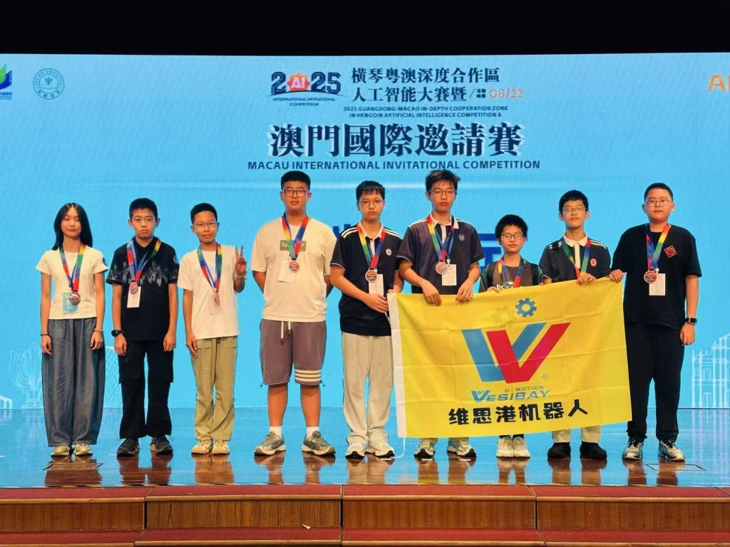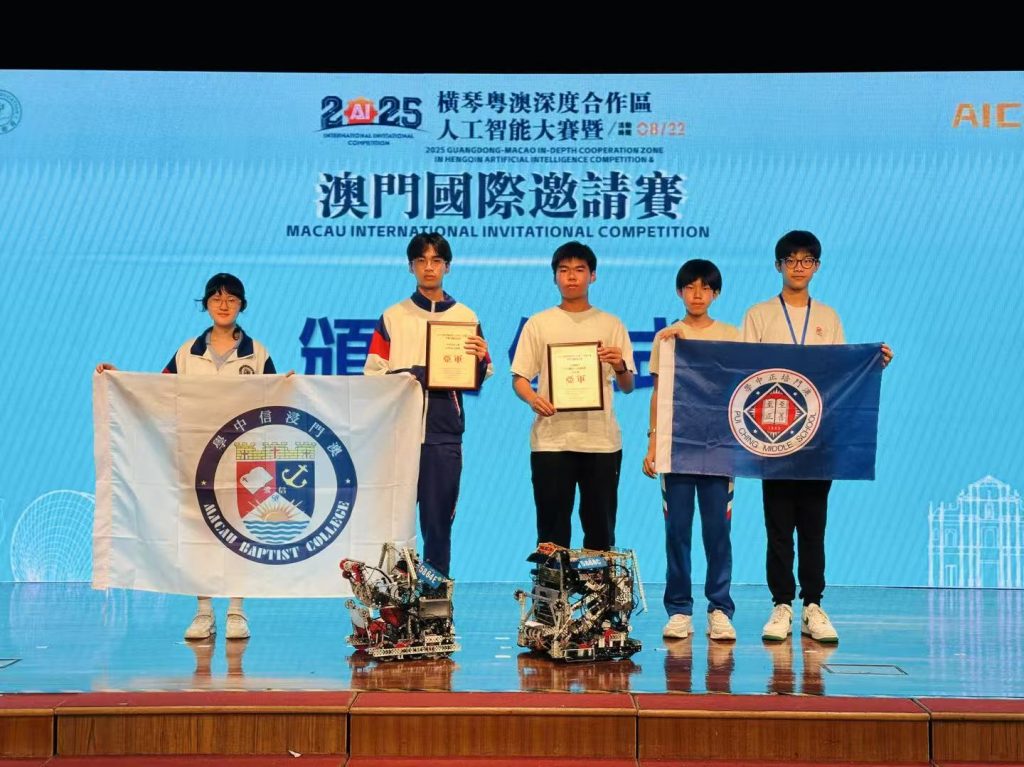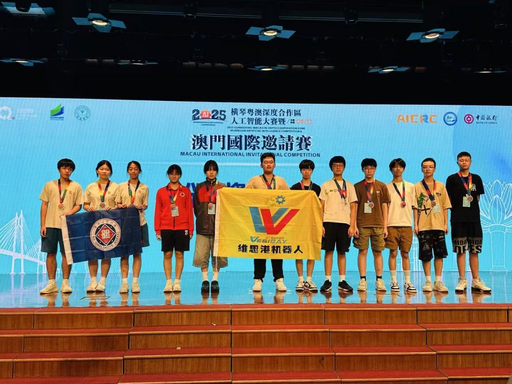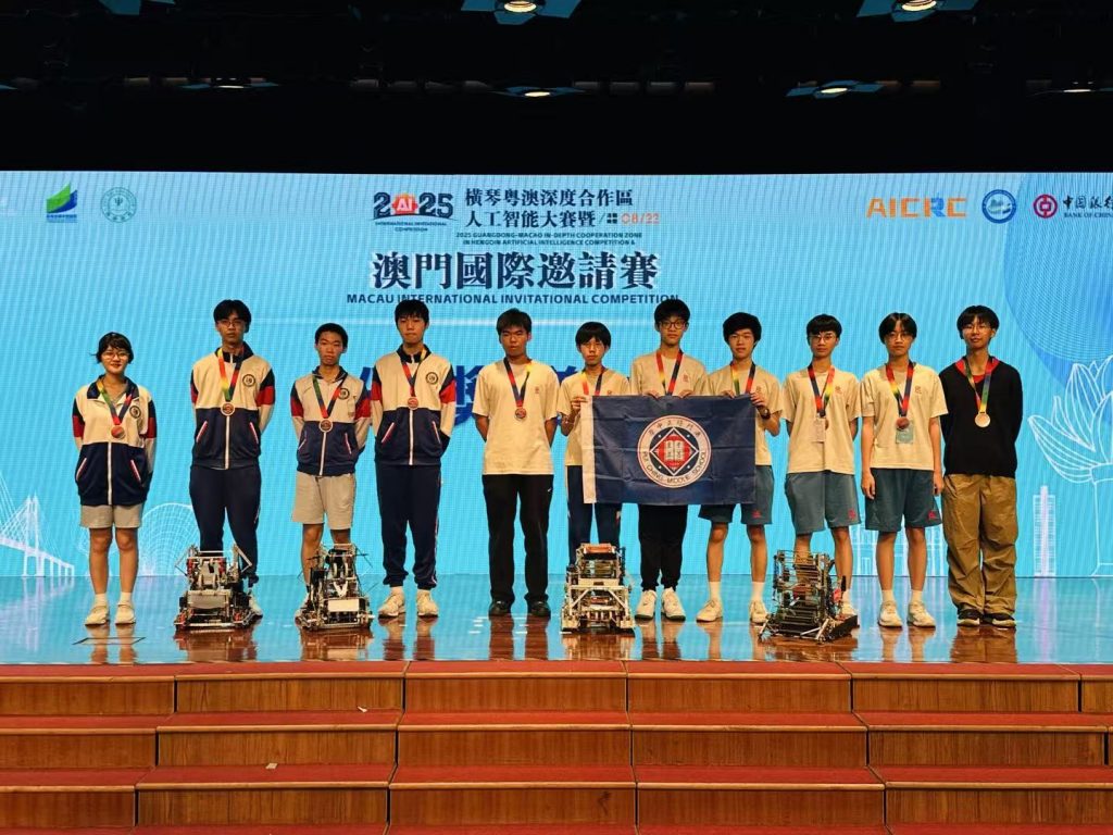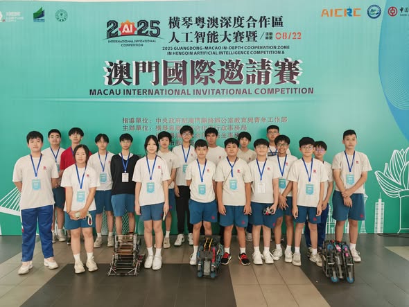 近日,2025年橫琴粵澳深度合作區人工智能大賽暨澳門國際邀請賽在澳門培正中學舉行,來自全球212所學校的814名選手在現場展開科技與創意的比拼。其中有近200名澳門選手主場參賽,澳門及國際參賽隊伍數量均創曆史新高。我校VEX機器人團隊共派出7支隊伍,共21名初高中學生參與VEX賽事的VRC和IQ賽項。經過激烈角逐,最終勇奪2亞2季的好成績。