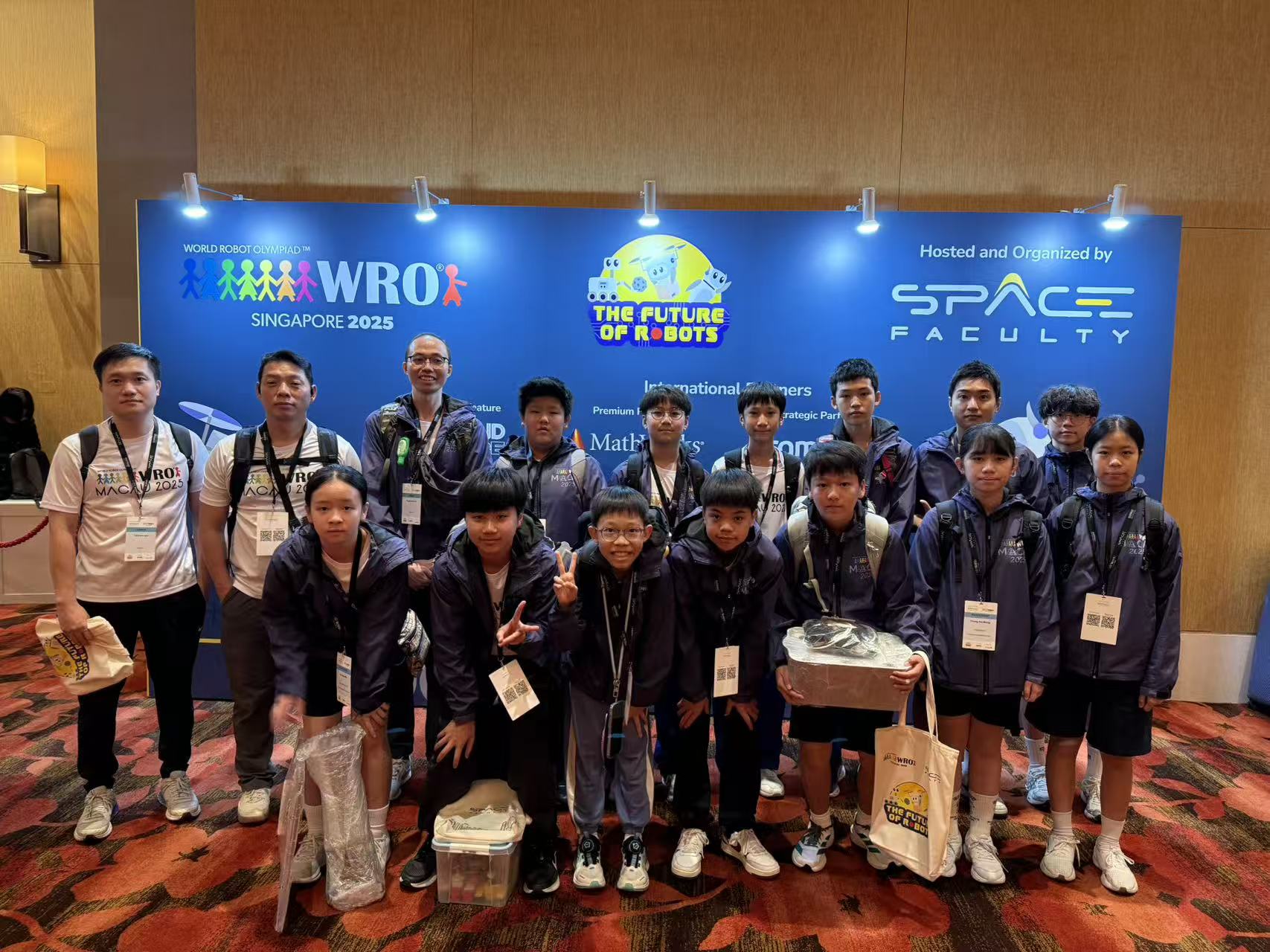 本校學生於2025年11月26日至28日參加由World Robot Olympiad(WRO)組委會主辦、在新加坡濱海灣金沙會議展覽中心舉行的World Robot Olympiad™ INTERNATIONAL FINAL,賽事規模盛大,來自100多個國家和地區的595支隊伍、逾3500名科技少年同場競技。我校代表隊在國際舞台表現卓越,於RoboMission Elementary賽項奪得銀獎(易樂衡、梅優、廖梓新),並以第七名的佳績創下澳門歷年參與該項目決賽的最佳排名(指導老師:袁國展);在RoboMission Junior賽項勇奪銀獎(呂建霆、黃迦諾、梅禮杰,指導老師:林達鑫);於Future Innovators Elementary賽項取得銅獎(胡溢晴、胡諾珩、許子昊,指導老師:袁國展)。是次賽事考驗同學在機械結構搭建、程式設計、策略調整與即場應變等綜合能力,充分展現我校在STEM教育上的扎實成果與國際競技力。期盼同學在指導老師的悉心栽培下,持續拓展視野、勇於創新,於未來的國際舞台再創高峰。