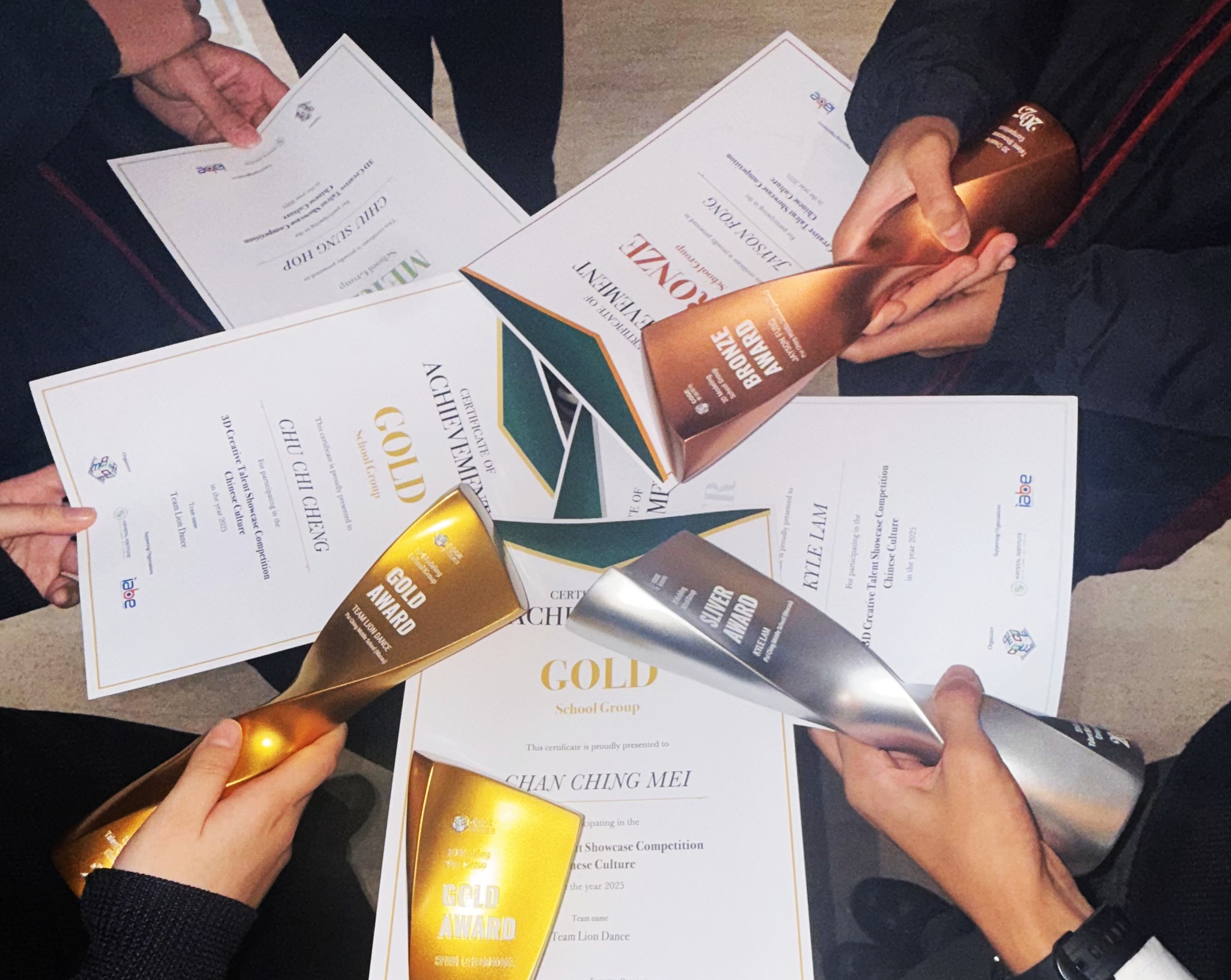 交流活動教育成果最新消息設科日常 本校學生參加3D才華展示比賽包攬中學組金銀銅獎 2025 年 12 月 15 日2025 年 12 月 15 日 0 Comments 本校學生參加3D才華展示比賽包攬中學組金銀銅獎 12月14日「國際人工智能及創意大會 (IAICC)」+「2025年3D創作才華展示比賽」頒獎暨展覽開幕式於深圳清華大學研究所舉行,由盧永強老師帶領前往。 本次比賽主題以「中華文化」為主題,創作者通過3D技術表達對文化、情感與人性的獨特見解。 我校獲獎同學如下: 中學組: 高一正班_朱芷澄,初三善班_陳靜美(金獎) 高一正班_林文洛:(銀獎) 初二正班_馮子丞:(銅獎) 高三正_趙崇合:(優異獎) 公開組: 沈正剛(金獎,盧永強代領)