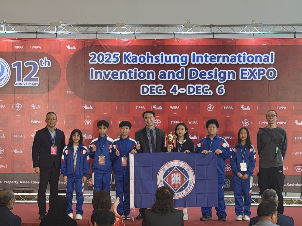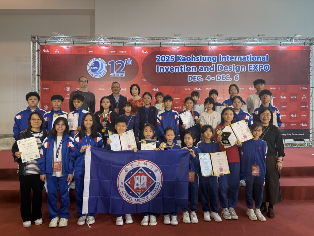 由世界發明智慧財產聯盟總會(WIIPA)及台灣發明商品促進協會(TIPPA)共同主辦的「2025高雄KIDE國際發明暨設計展」,於12月4至6日在高雄展覽館隆重舉行。本屆賽事匯聚來自中國(含港澳台)、美國、德國、法國、日本、韓國等33個國家和地區,共488件作品參賽。澳門培正中學派出多支隊伍,經過連日來的激烈角逐,本校學生憑藉出色的創新思維與實踐能力,在國際舞台上大放異彩,共斬獲4金4銀,以及WIIPA鉑金獎及多個國家特別獎,成績斐然。