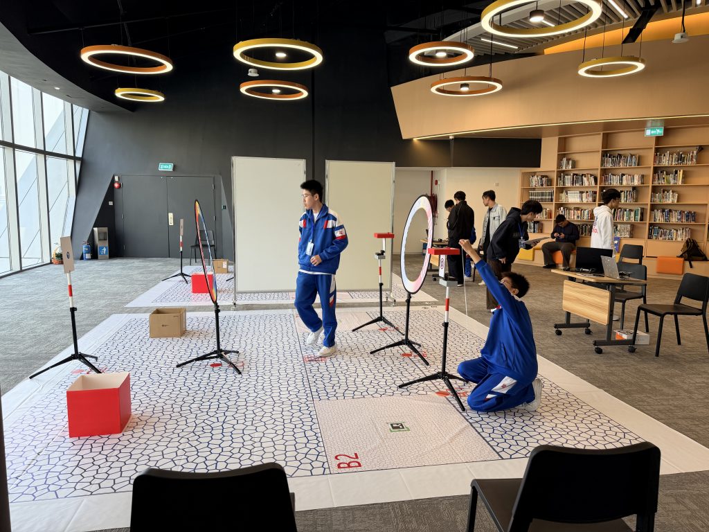 《北斗無人機編程應用創意賽》重點考察學生的邏輯程式設計能力與臨場應變能力。比賽要求參賽團隊在現場限時編寫程式,控制無人機完成一系列高難度任務,包括:從指定區域起飛並獲取物資、規劃飛行路徑穿越直徑不小於70厘米的圓門障礙、完成指揮箭頭的拍照識別,以及精準投放物資至目標區域。整個過程不僅考驗學生的編程技術,更對其路徑規劃、團隊協作及抗壓能力提出了極高要求。我校參賽同學在比賽中沉著應對,展現出紮實的編程基礎與出色的邏輯思維能力,成功完成多項任務,獲得評審的高度肯定。