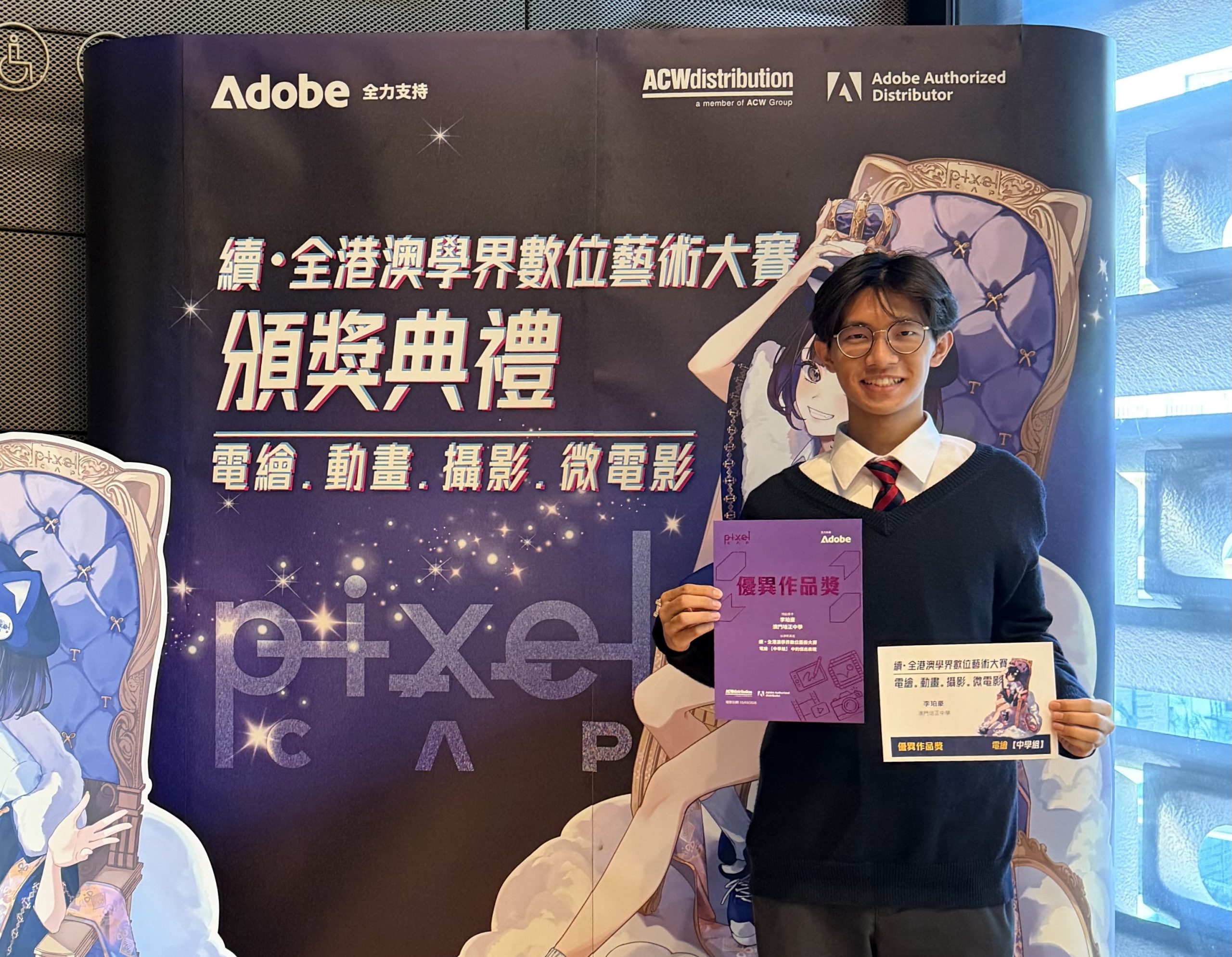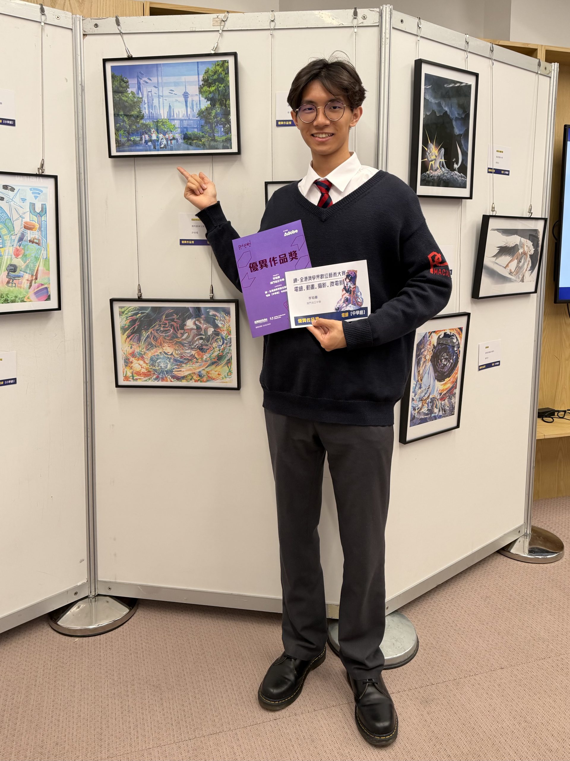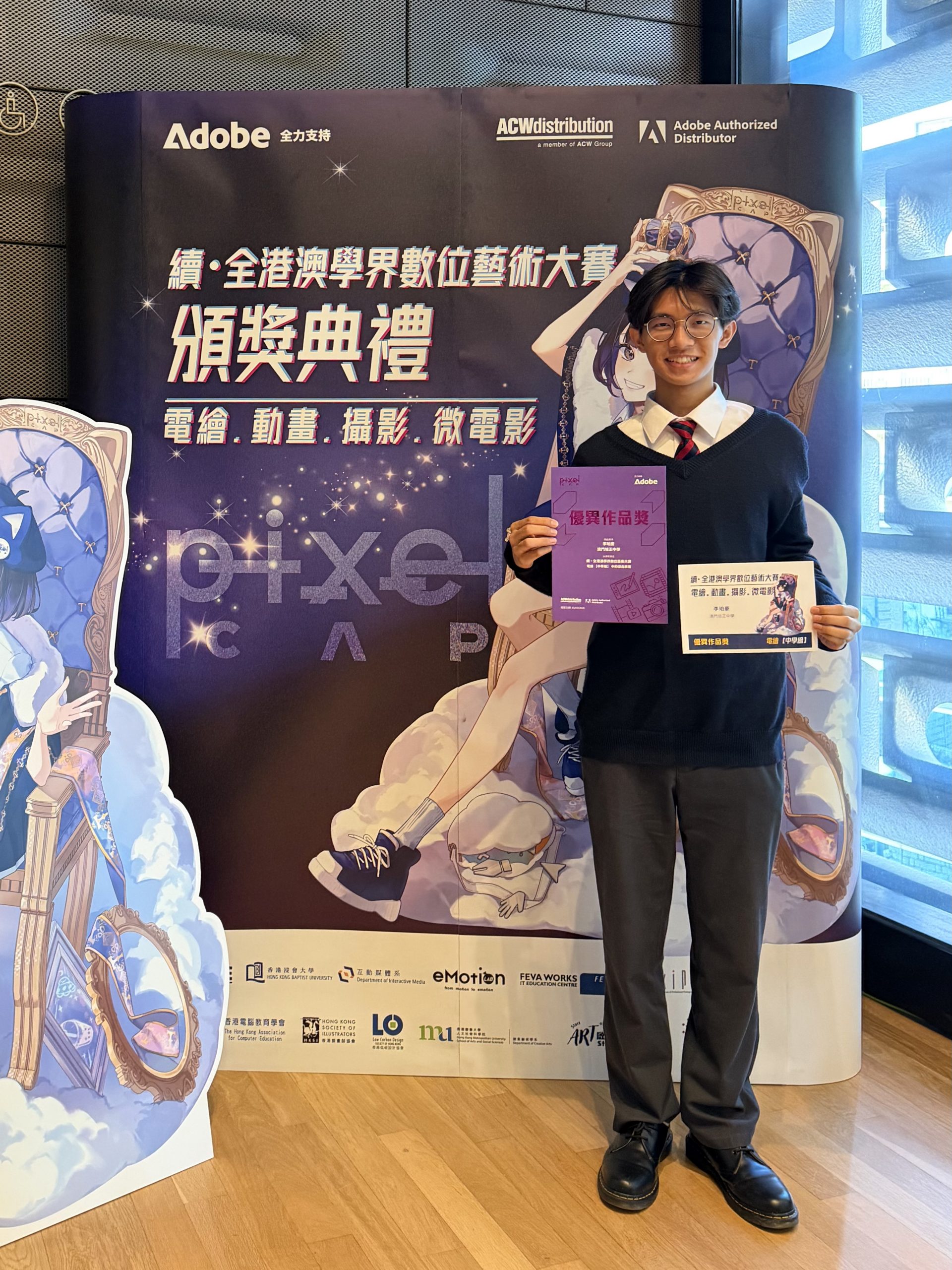 3月15日由Adobe全力推動的Pixel CAP(像素創意藝術計劃)「續·全港澳學界數位藝術大賽」圓滿落幕。我校高三愛班學生李珀豪憑藉扎實的數位藝術功底與獨特的創意表達,在眾多參賽作品中脫穎而出,榮獲優異獎,為學校贏得榮譽。