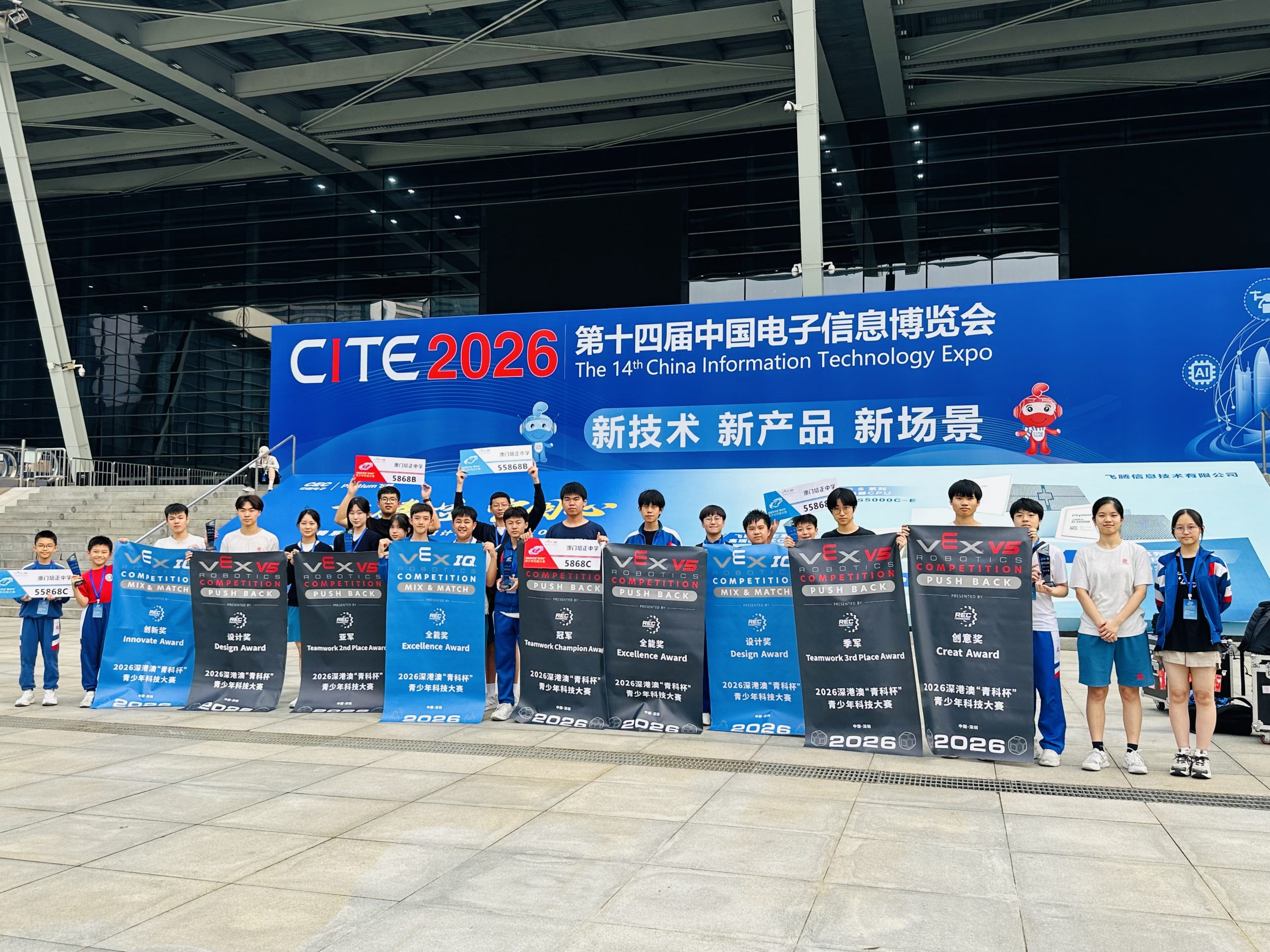 4月10日至11日,來自我校VEX機器人團隊、涵蓋小學至高中不同組別的共22名學生,赴深圳參加「2026年深港澳『青科杯』青少年科創大賽」,與來自多個地區的優秀隊伍同場競技,最終奪得9項大獎,成績令人鼓舞。