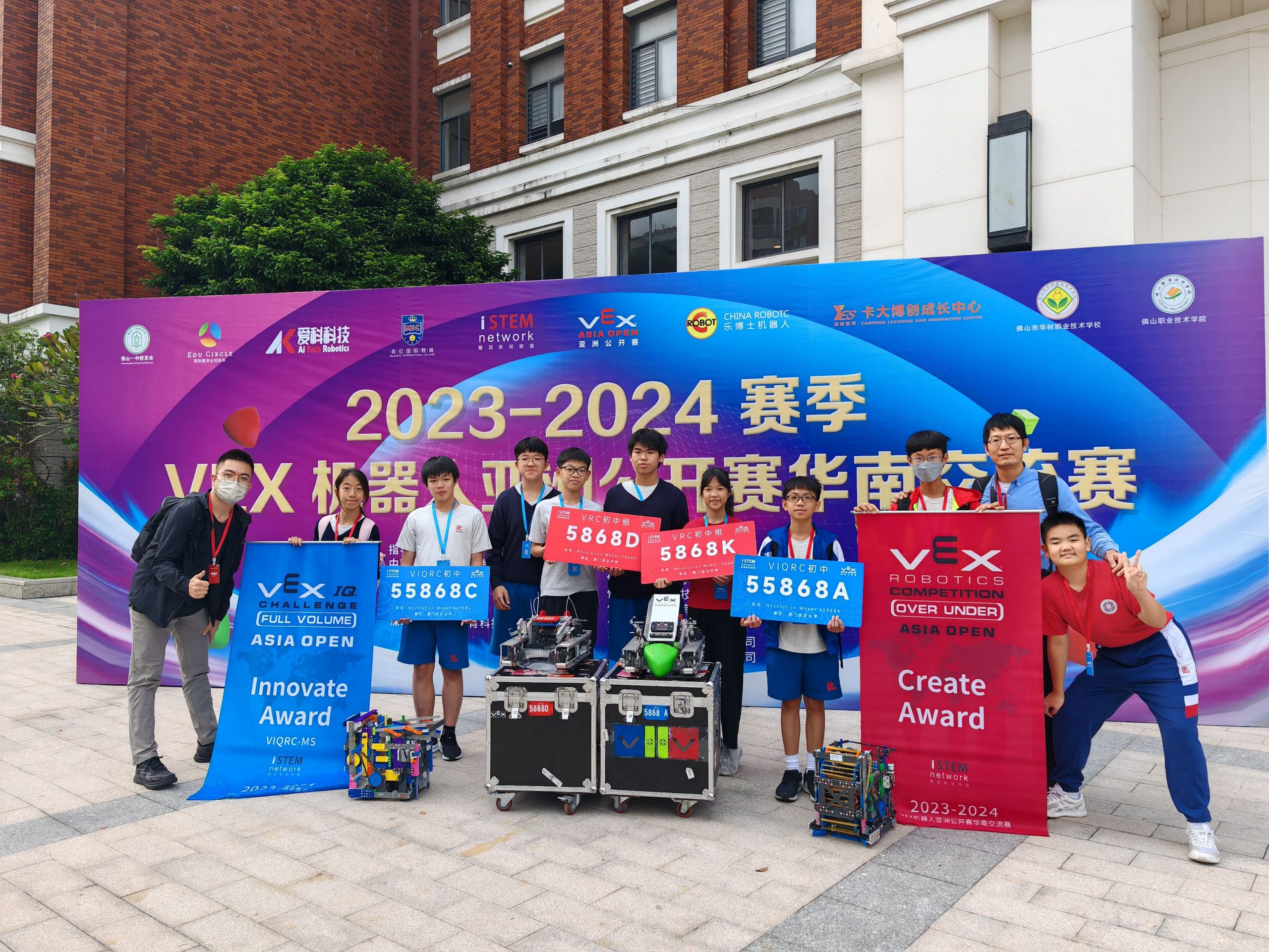 10月20日-22日,VEX機器人亞洲公開賽華南交流賽在佛山舉辦。本次賽事吸引了來自廣東、北京、澳門、長沙等全國各地200多支賽隊共1000多名選手參賽。最終我校隊伍55868C(李尚林、林潁晴)和5868K(袁沛平、閔語心)憑藉出色的工程筆記與面試表現分別獲得初中組VIQC【最佳創意獎-Innovate Award】和初中組VRC【最佳創新獎-Create Award】。